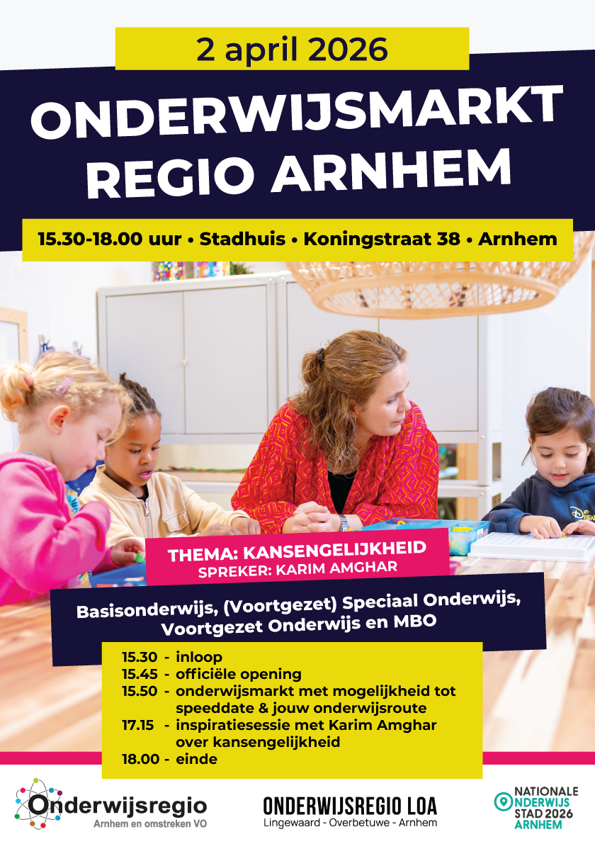 Op donderdag 2 april 2026 vindt de Onderwijsmarkt plaats in het Stadhuis van Arnhem. Deze middag staat in het teken van ontmoeten, ontdekken en oriënteren. Je komt in contact met meer dan 50 scholen en onderwijsorganisaties uit de regio en krijgt de kans om laagdrempelig in gesprek te gaan over werken in het onderwijs.